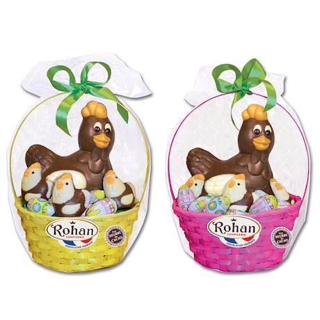 Jolie corbeille garnie d'un assortiment de moulages en chocolat de pâques, idée cadeau pour les petits et les grands.
