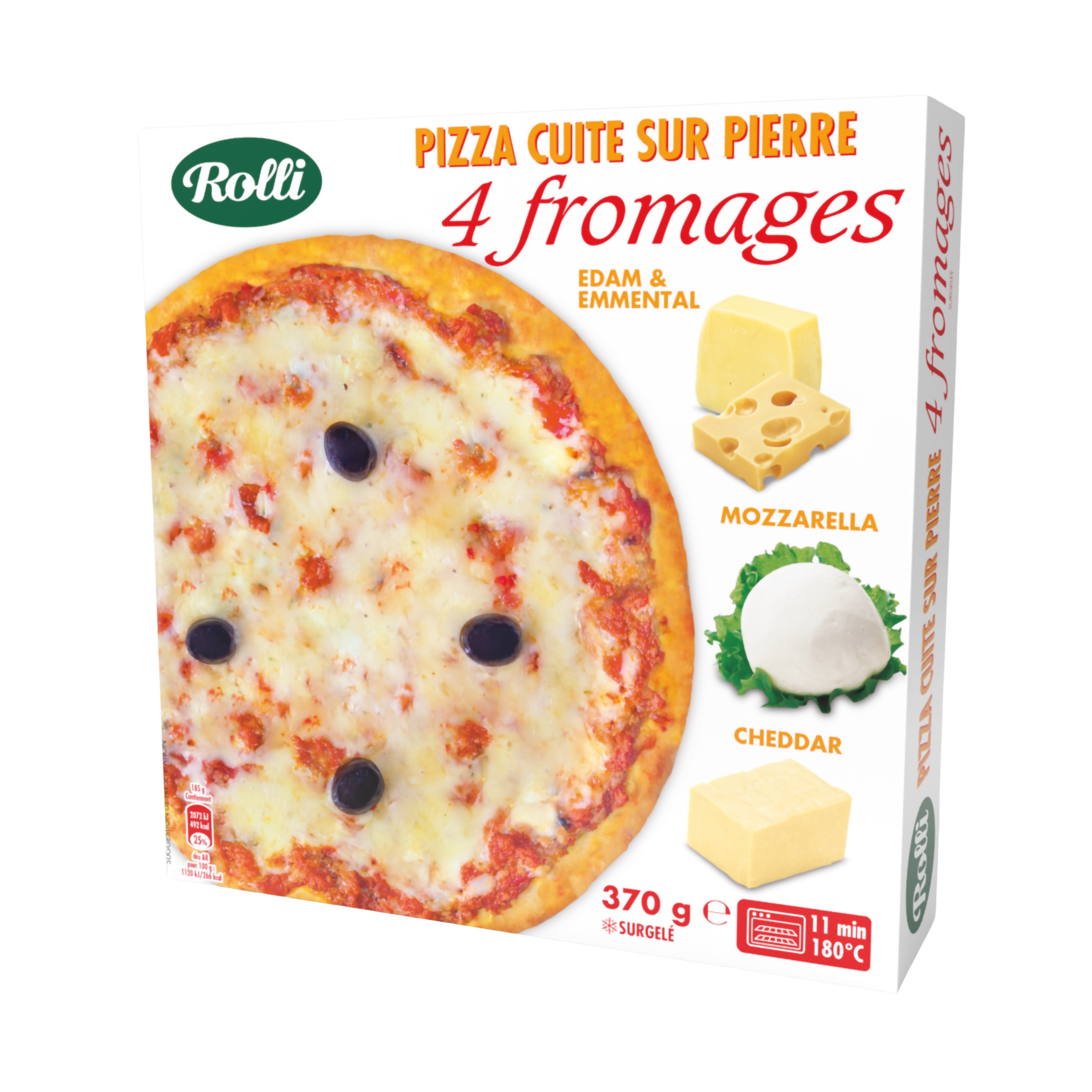 Pizza cuite sur pierre garnie de 4 fromages, surgelée
