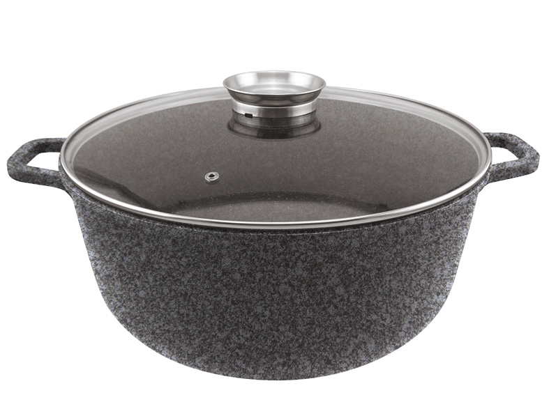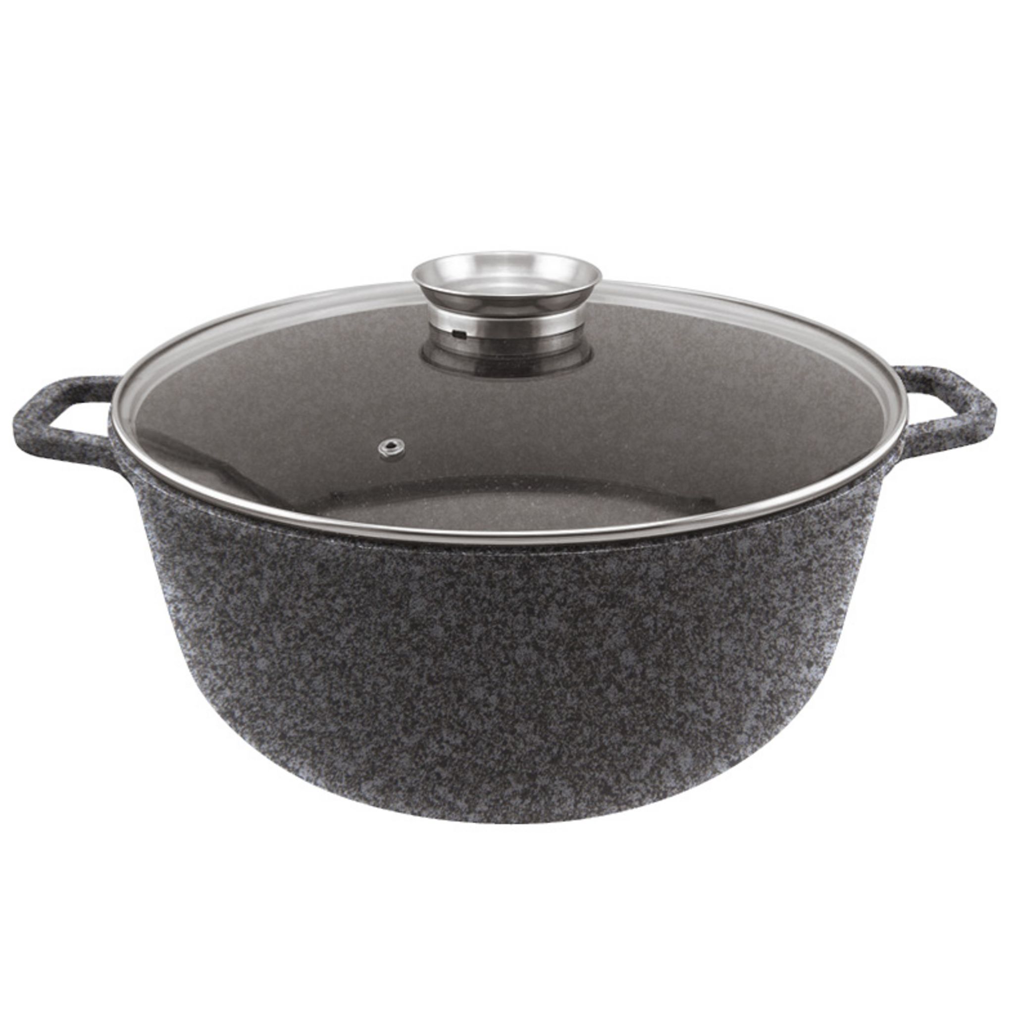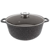 Cuisinez de délicieux repas grâce à ce faitout XXL 40 cm en fonte d'aluminium aspect pierre avec couvercle en verre. Ce faitout est compatible tous feux dont induction, compatible four jusqu'à 200° (sans le couvercle) et permet une cuisson homogène des aliments. Son revêtement anti adhérent est ultra résistant pour une cuisson sans matière grasse. Poignées fixes avec maniques de protection offertes. Bénéficiez d'un entretien facile grâce à sa compatibilité au lave vaisselle.
