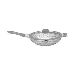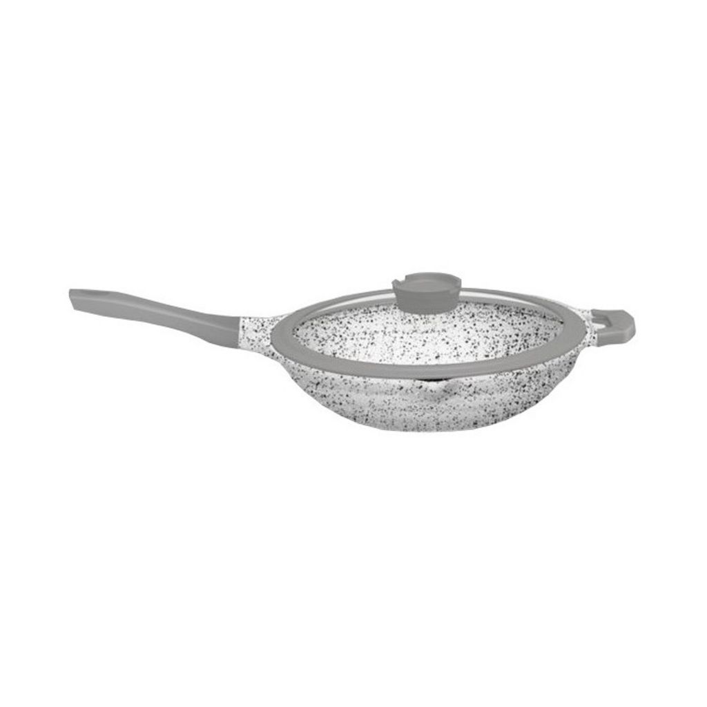 Sauteuse avec couvercle en verre Rossetto de la gamme Bo Granite Wave en fonte d'aluminium revêtement effet granité. Coloris extérieur gris clair, manche silicone pour une bonne prise en main.
