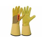 Gants PRO épines & ronces en croûte avec manchette de protect.Dos du gant en cuir façon velours traité pour une résistance à l'eau et aux huiles. Ce gant est idéal pour le travail des rosiers et des gros épineux : taille et débroussaillage. Matière souple, confortable, respirante et légère. Gant a