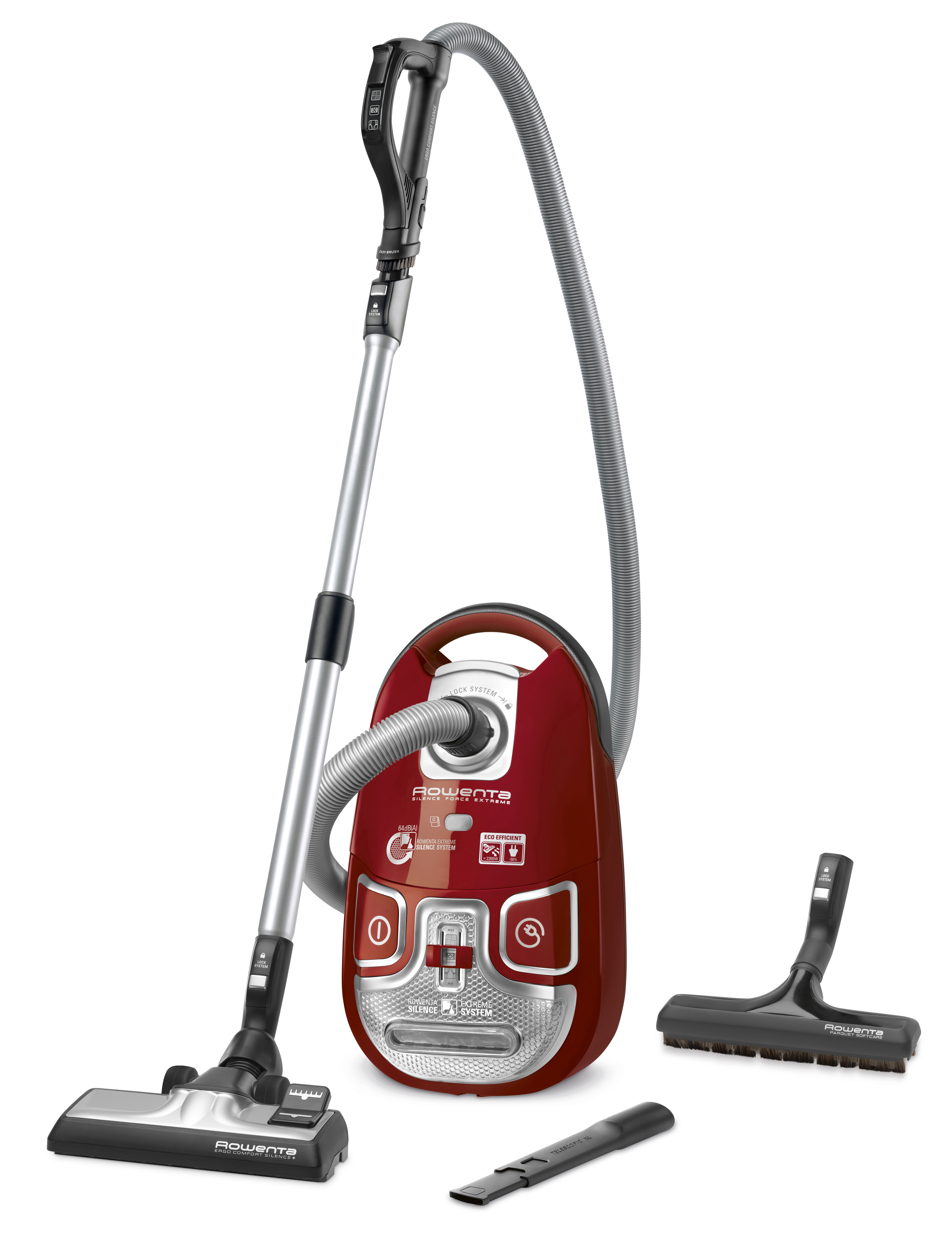 Aspirateur silence force extreme rouge RO5933EB. Aspirateur avec sac extrêmement puissant et silencieux ! Un niveau sonore extrêmement bas de 64 dB, proche d'une conversation normale, sans aucun compromis sur la puissance d'aspiration, grâce à sa conception "Eco efficient", qui en fait un appareil p