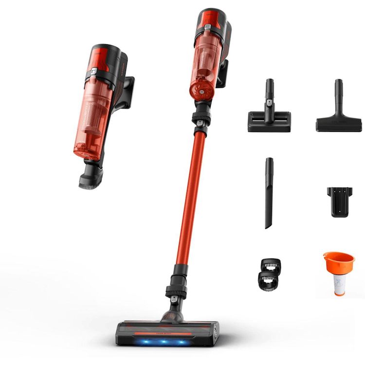 | Aspirateur à main | Nécessite d'enlever le tube et d'utiliser les différents accessoires et brosses fournis pour une utilisation d'appoint (ex: table, voiture, fauteuil) | |