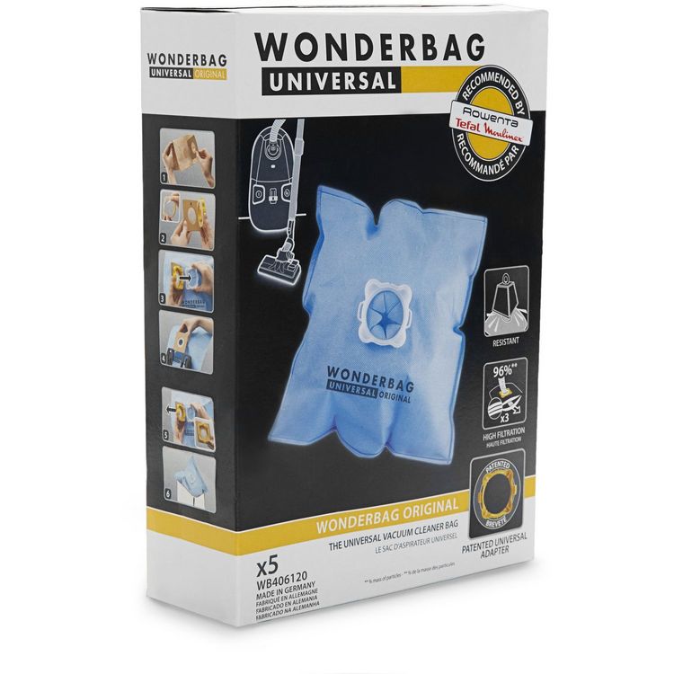 Pochette de 5 sacs aspirateurs Wonderbag classic et un adaptateur universel. Il suffit de garder la cartonnette de votre ancien sac Coller l'adaptateur universel à votre cartonnette. Clipser l'adaptateur au sac Wonderbag. Trois filtres de filtration et un traitement anti-bactéries pour une hygi
