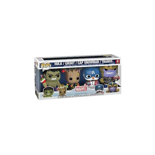Le pack de 4 figurines Funko Pop! Marvel Holiday de la marque Roxy est une collection exclusive en vinyle, mesurant entre 9 et 10 cm. Cette série met en scène des personnages emblématiques de Marvel comme Hulk, Groot, Captain America en bonhomme de neige et Thanos, habillés pour les fêtes. Elles pré