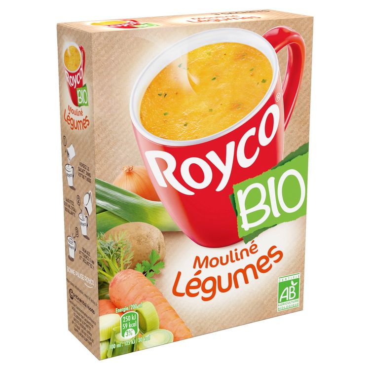 Découvrez dans notre gamme BIO la recette Mouliné de Légumes, une soupe bio à la texture légère et au délicieux goût de légumes ! Cete délicieuse soupe vous apportera plaisir et réconfort à tout moment de la journée. Pour varier vos pauses, découvrez aussi dans notre gamme Bio : Royco Bio Velouté Tomates Royco Bio Mouliné Poireaux Pommes de terre Royco, quand la pause s'impose ! Découvrez les soupes Royco, idéales pour toutes les pauses, pour un simple petit creux ou lors d'un repas pris sur le pouce, au déjeuner ou au dîner, à la maison ou sur votre lieu de travail… Royco, ce sont de délicieuses soupes : - Pour se faire plaisir : plus de 30 savoureuses recettes, légères ou plus gourmandes, avec des vermicelles, des petits morceaux de légumes ou des croûtons croustillants. - Pratiques à transporter et à ranger : dans une boite petite et légère avec à l'intérieur des sachets individuels qui peuvent se glisser partout (dans son sac à main ou dans le tiroir du bureau...) - Faciles et rapides à préparer : un mug, de l'eau bouillante, 2 minutes d'attente et c'est prêt ! Soupe Instantanée