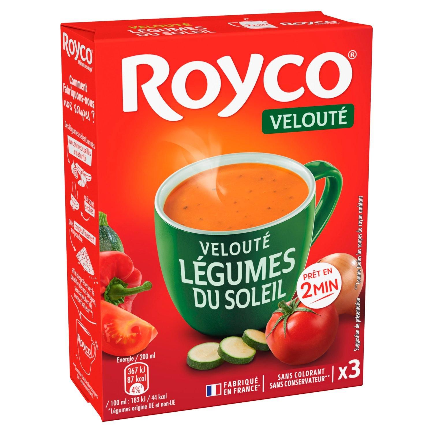 Afin de préserver la qualité de nos soupes, sans ajouter de conservateur** ! **Comme toutes les soupes du rayon ambiant. Quel est le secret d'une délicieuse soupe Royco ? Notre savoir-faire français Depuis plus de 60 ans Royco met en œuvre son savoir-faire pour vous proposer des soupes toujours plus gourmandes et réconfortantes. Comment fabriquons-nous nos soupes ? Des légumes sélectionnés avec soin et cueillis à maturité qui sont séchés puis coupés finement en poudre Variez les plaisirs Royco Crèmeux champignons Royco Exotique soupe l'indienne