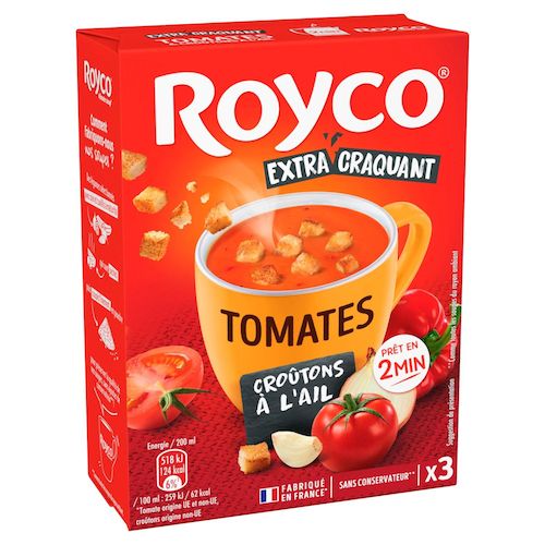 Pour préserver la qualité de nos soupes, sans ajouter de conservateur** ! **Comme toutes les soupes du rayon ambiant. Quel est le secret d'une délicieuse soupe Royco ? Notre savoir-faire français Depuis plus de 60 ans, Royco met en œuvre son savoir-faire pour vous proposer une gamme à la texture onctueuse et aux croûtons extra-craquants. Comment fabriquons-nous nos soupes ? Des légumes sélectionnés avec soin et cueillis à maturité qui sont séchés puis coupés finement en poudre Variez les plaisirs Royco Crémeux champignons Royco Exotique soupe à l'indienne