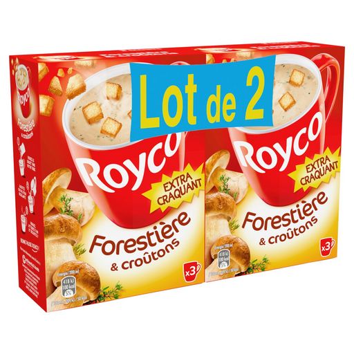 Ingrédients de la soupe déshydratée: croûtons au thym 30 % (farine de blé, huile de palme, sel, plantes aromatiques dont thym 0,2%, arômes naturels, riz, sel, levure, antioxydant : extrait de romarin),amidon de pomme de terre,sirop de glucose,huile de palme,arômes (contient : orge),sel,extrait de champignons 2.6%,champignons des bois 1,8 % (cèpes, bolets),lactose et protéines de lait,oignon,ciboulette,émulsifiant : E471,extrait de malt d'orge,stabilisants : E340 et E452,céleri. Peut contenir des traces de soja.