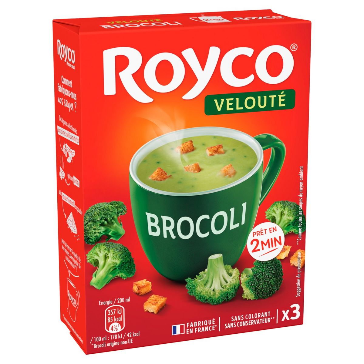 Pour préserver la qualité de nos soupes, sans ajouter de conservateur** ! **Comme toutes les soupes du rayon ambiant. Quel est le secret d'une délicieuse soupe Royco ? Notre savoir-faire français Depuis plus de 60 ans Royco met en œuvre son savoir-faire pour vous proposer des soupes toujours plus gourmandes et réconfortantes. Comment fabriquons-nous nos soupes ? Des légumes sélectionnés avec soin et cueillis à maturité qui sont séchés puis coupés finement en poudre Variez les plaisirs Royco Crémeux champignons Royco Extra craquant légumes & croûtons