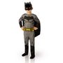 La combinaison est de couleur grise. Elle possède des imprimés très réalistes représentant des muscles, le logo de Batman et une ceinture jaune. Le dos de la tenue est quant à lui uni. La combinaison se ferme dans le dos à l'aide d'un velcro. La cape de couleur noire se maintient sur les épaules à l'aide de velcros. Le demi-masque est en plastique rigide noir. Il se porte facilement à l'aide d'un élastique.