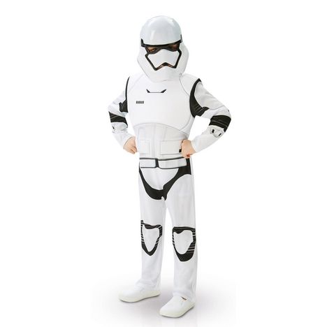La combinaison blanche et noire possède des imprimés très réalistes, imitant à la perfection la tenue portée par les soldats. Elle se compose également de plusieurs parties en mousse notamment sur le buste qui apporte du réalisme à l'ensemble. Elle se ferme dans le dos à l'aide de velcros. Le masque semi-rigide de Stormtrooper viendra finaliser cette tenue. Il est en plastique se maintient à l'aide d'un élastique.