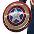 Un bouclier en plastique rouge, bleu et argenté métallisé Captain America. 30,5 centimètres de diamètre. Lanières élastiques à l’arrière pour fixation sur l’avant-bras et le poignet.