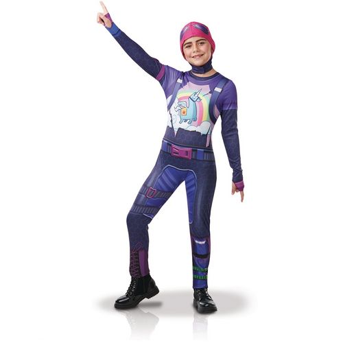 Déguisement ado Fortnite Brite Bomber taille 13-14 ans. Il comprend une combinaison intégrale imprimée recto-verso, une cagoule en tissu, un brassard à attacher autour du bras, un couvre-canette Gourde du Brave