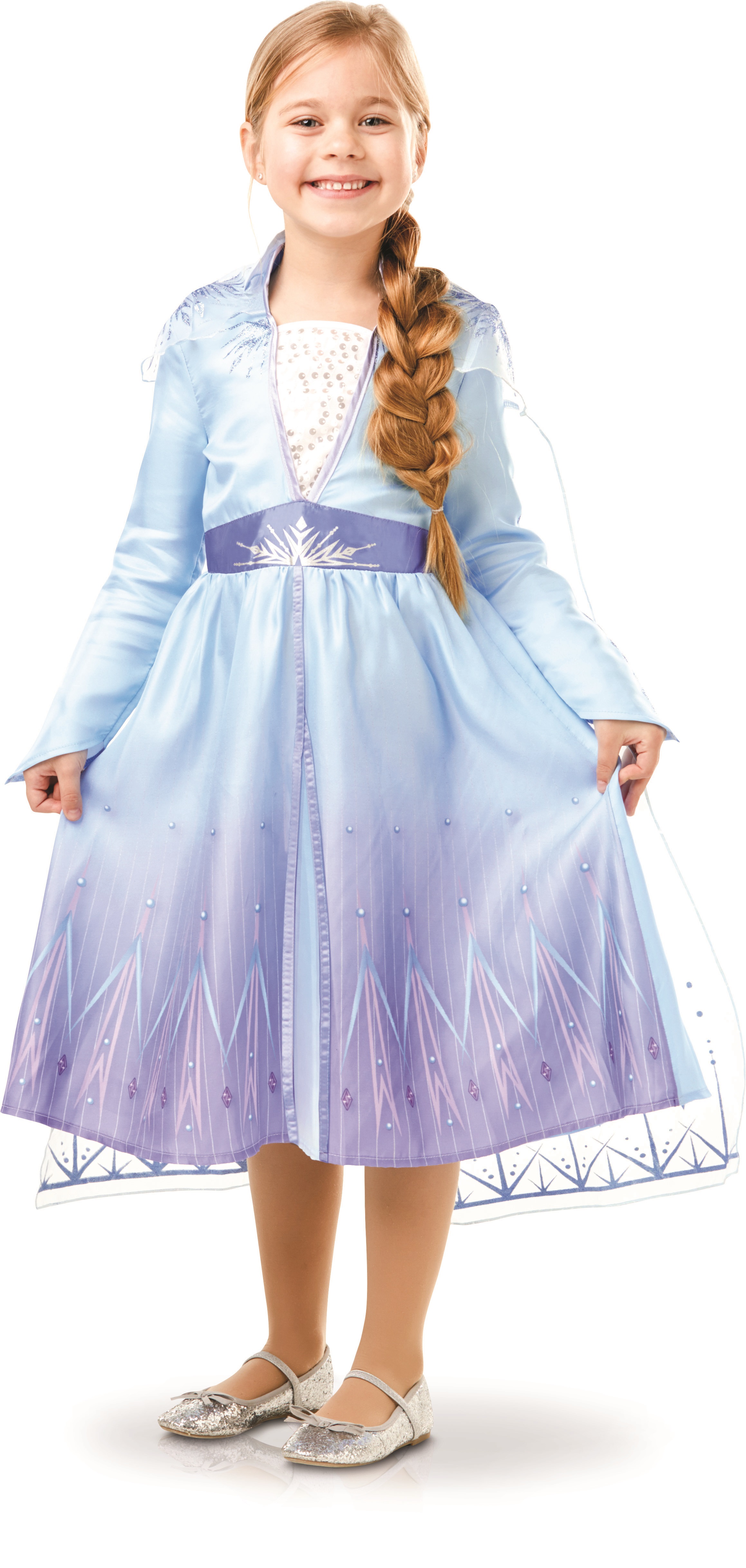 Le déguisement d'Elsa de la Reine des Neiges 2 est désormais un classique des malles déguisement ! Ce déguisement comprend une robe en satin et jersey imprimé, une jupe en tissu imprimé et une cape. Ce déguisement La Reine des Neiges 2 taille en 5/6 ans.