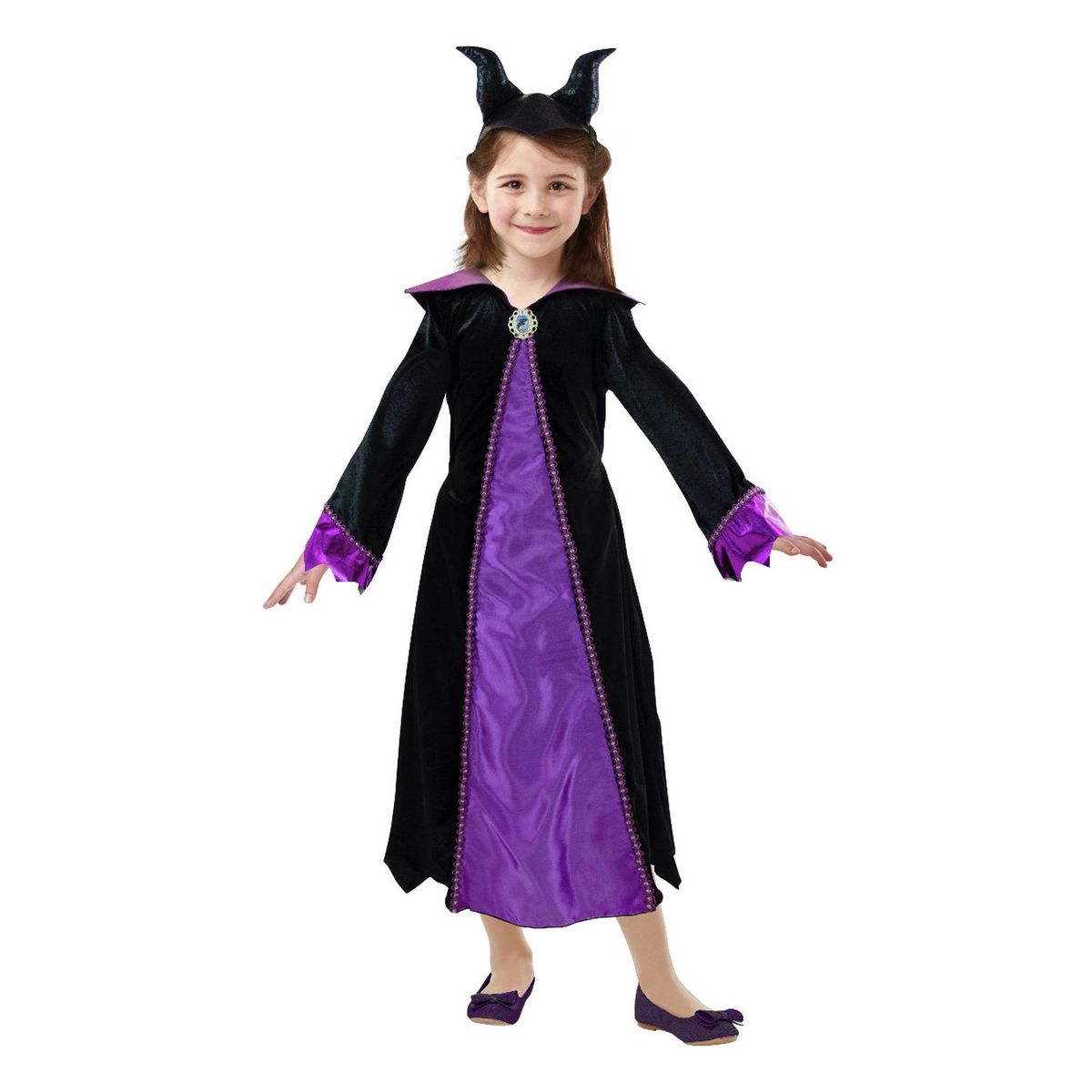 La robe effet velours et avant violet satiné avec col noir sera est parfaite pour ressembler à Maléfique ! Il y a même le serre-tête avec les cornes noires.