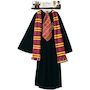 Une robe de sorcier en tissu jersey noir avec capuche intégrée et blason Gryffondor sur la poitrine. Une cravate rayée rouge et jaune avec attache élastique. Une écharpe en tissu assortie aux couleurs de Gryffondor. Une baguette Harry Potter en PVC.