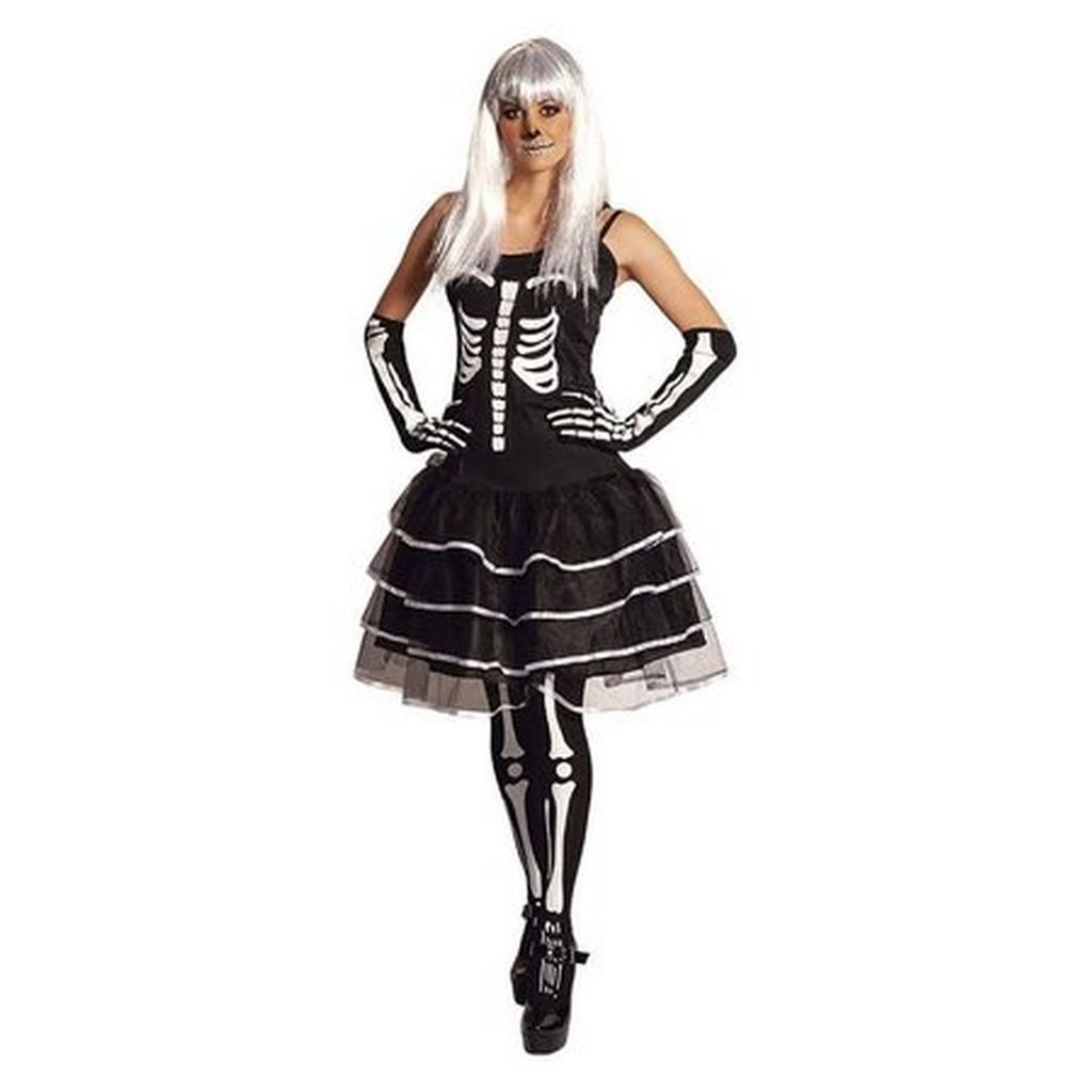 Déguisement adulte Tutu Squelette comprenant une robe tutu doublé d'une jupe en tissu, haut sans manche avec imprimé squelette, une paire de gants hauts imprimés et une paire de collants imprimés.