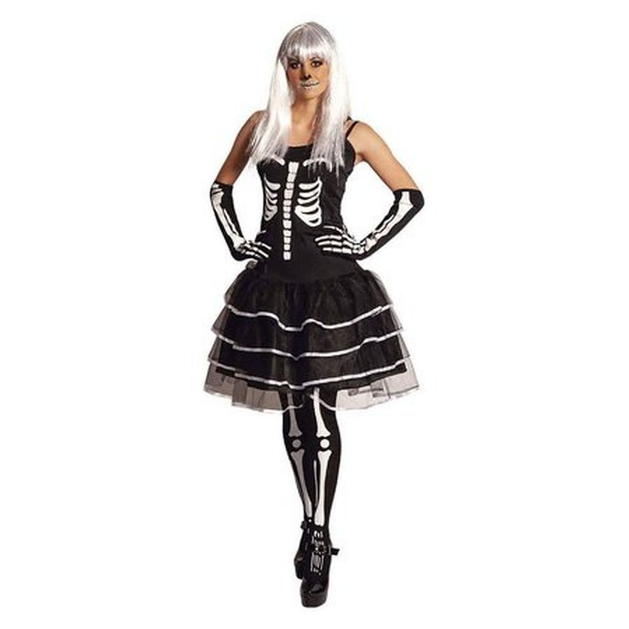 Comprend une robe tutu doublée d'une jupe en tissu, haut sans manche avec imprimé squelette, une paire de gants hauts imprimés et une paire de collants imprimés.