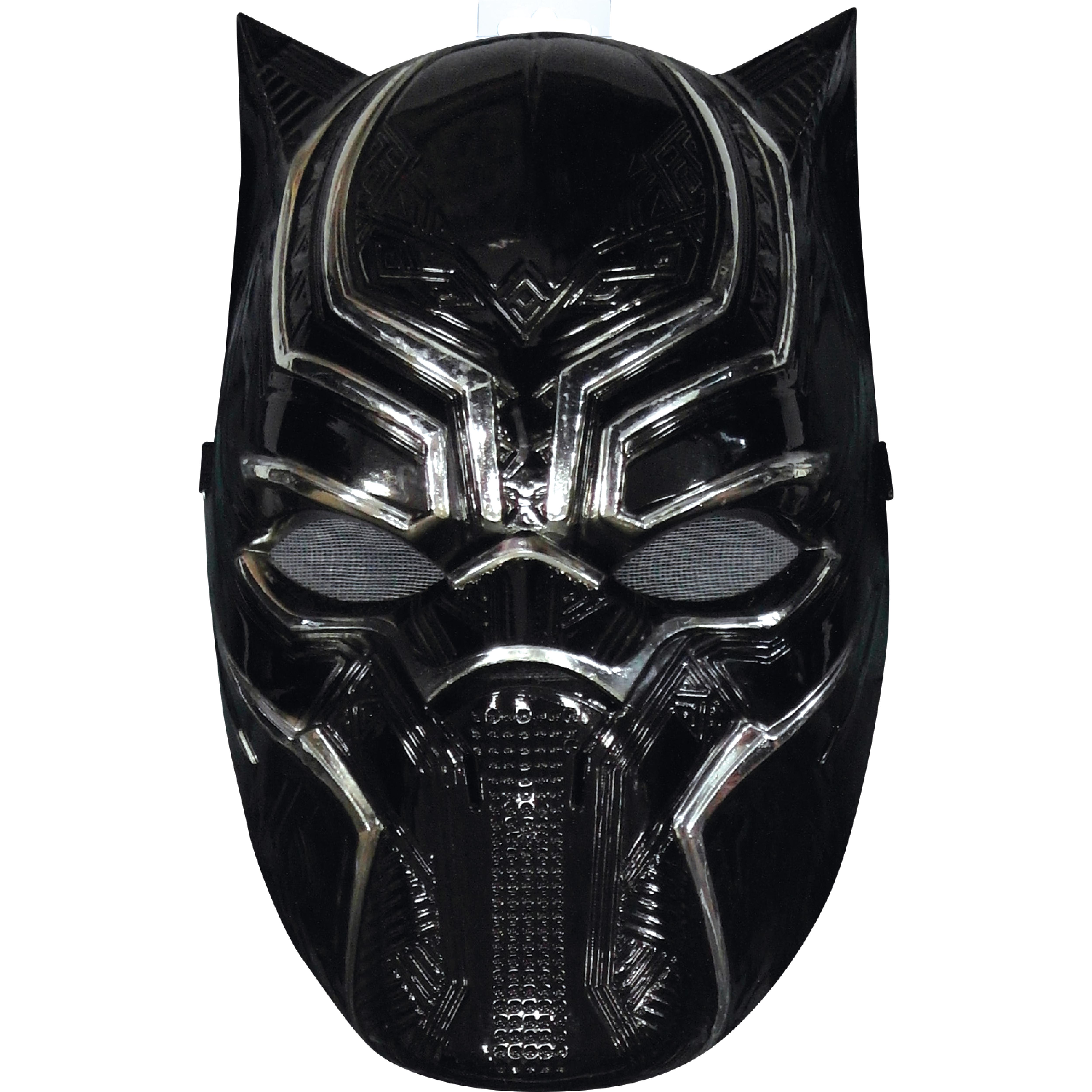Un masque en PVC noir et argenté à l’effigie du super-héros Black Panther. Attache élastique et système de fermeture velcro à l’arrière. Ouvertures pour les yeux.