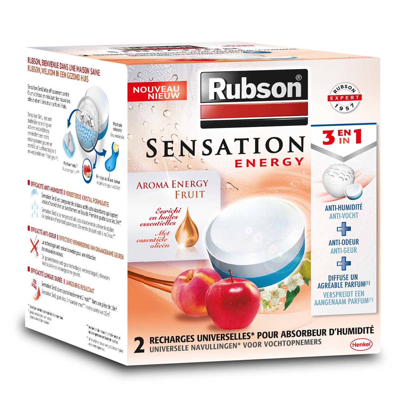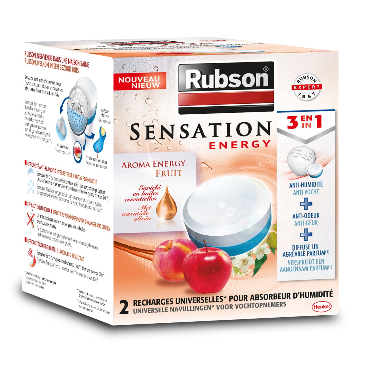 La recharge Sensation Energy Fruit est spécialement conçue pour l’absorbeur d’humidité Sensation. En absorbant l’excès d’humidité, l’absorbeur Sensation permet de lutter contre les mauvaises odeurs et aide à prévenir le développement des moisissures et des acariens, deu