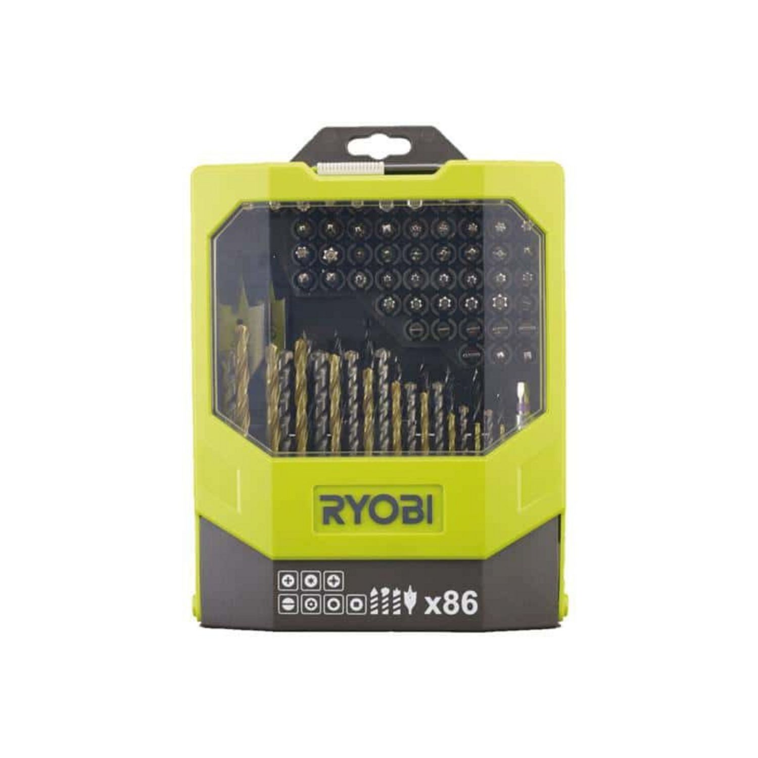 Coffret RYOBI 86 accessoires mixtes - perçage et vissage RAK86MIXC qui comprend 31 accessoires de perçage bois, maçonnerie, métal et 55 accessoires de vissage.