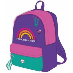 Sac à dos 1 compartiment FRENCH DISORDER RAINBOW, 1 poche avant zippée, Décor imprimé et brodé, Patch silicone, Badge, Tirettes en corde, Porte clé, Polyester 900 D + Velours, Doublure nylon personnalisée, Coloris Violet, Rose et Vert