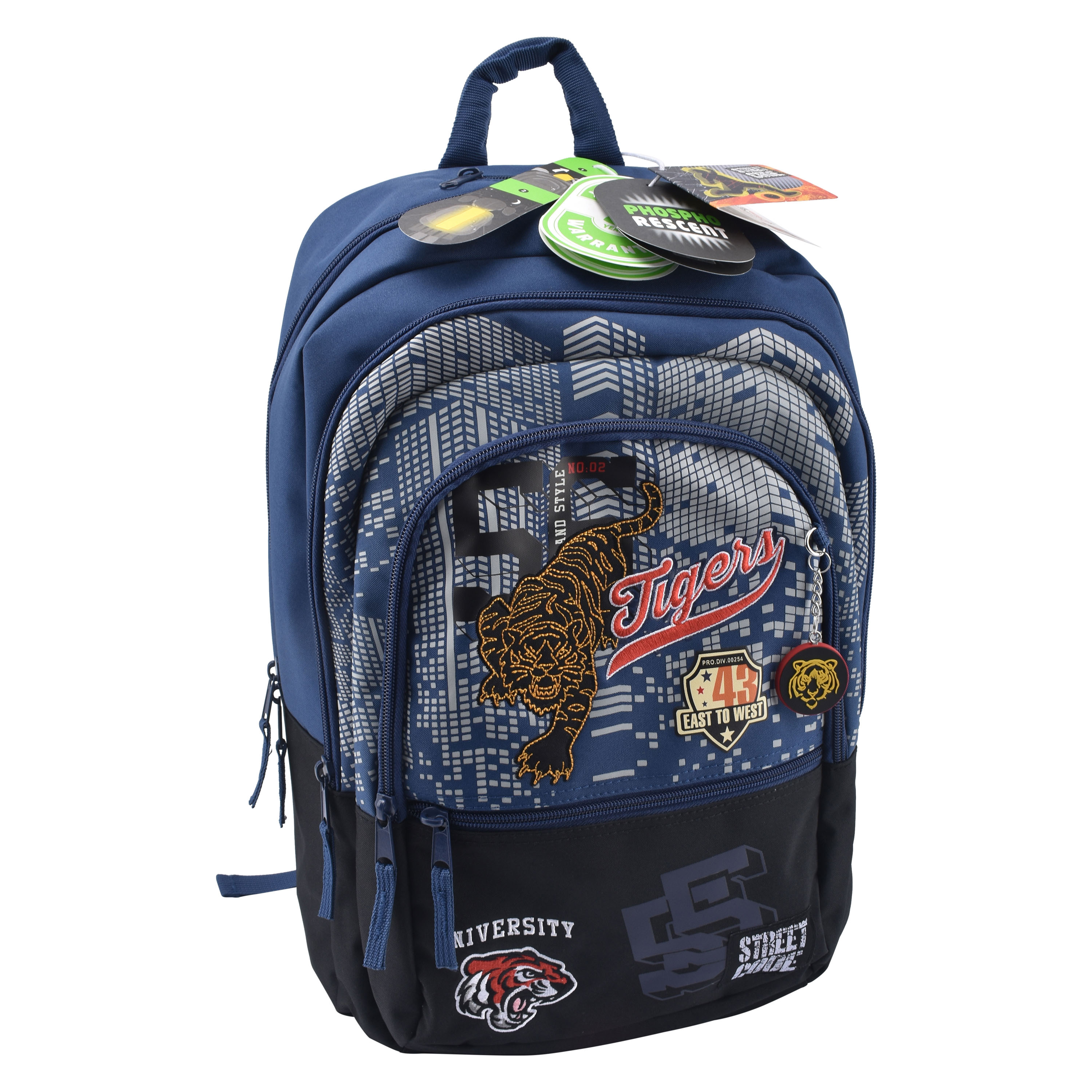 En savoir +Parfait dès l’entrée en CM2, ce sac à dos Premium 3 compartiments Tiger Street Code est le cartable idéal pour assurer confortablement une journée d’école ! Robuste et résistant, ce sac à dos affiche un design inspiré des universités américaines avec des écussons imprimés ou brodés et un porte-clés assorti pour plus de style. Il se démarque par des éléments phosphorescents disposés sur le devant du sac pour permettre à l’enfant d’être visible en cas de faible luminosité. La matière déperlante en polyester résiste à l’usure et aux intempéries. Doté d’une grande capacité de rangement fermé par glissière, ce sac scolaire possède un compartiment principal spacieux avec à l’intérieur une pochette ouverte, pour ranger classeurs, pochettes, livres et cahiers grands formats. Un agenda, une boîte de compas, la règle et les petites fournitures trouveront leur place dans le second compartiment fermé par zip. Deux petites poches zippées devant récupèrent en toute sécurité un paquet de mouchoirs,