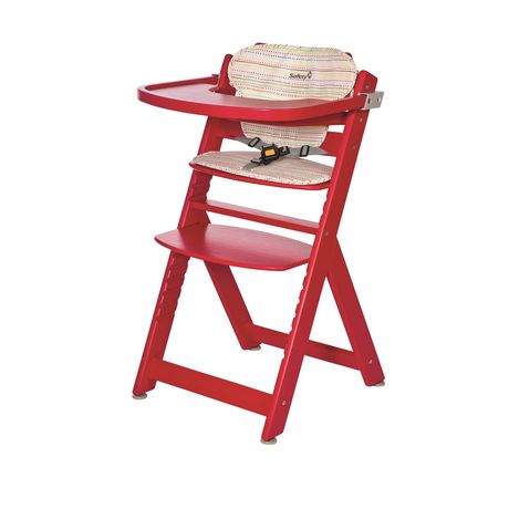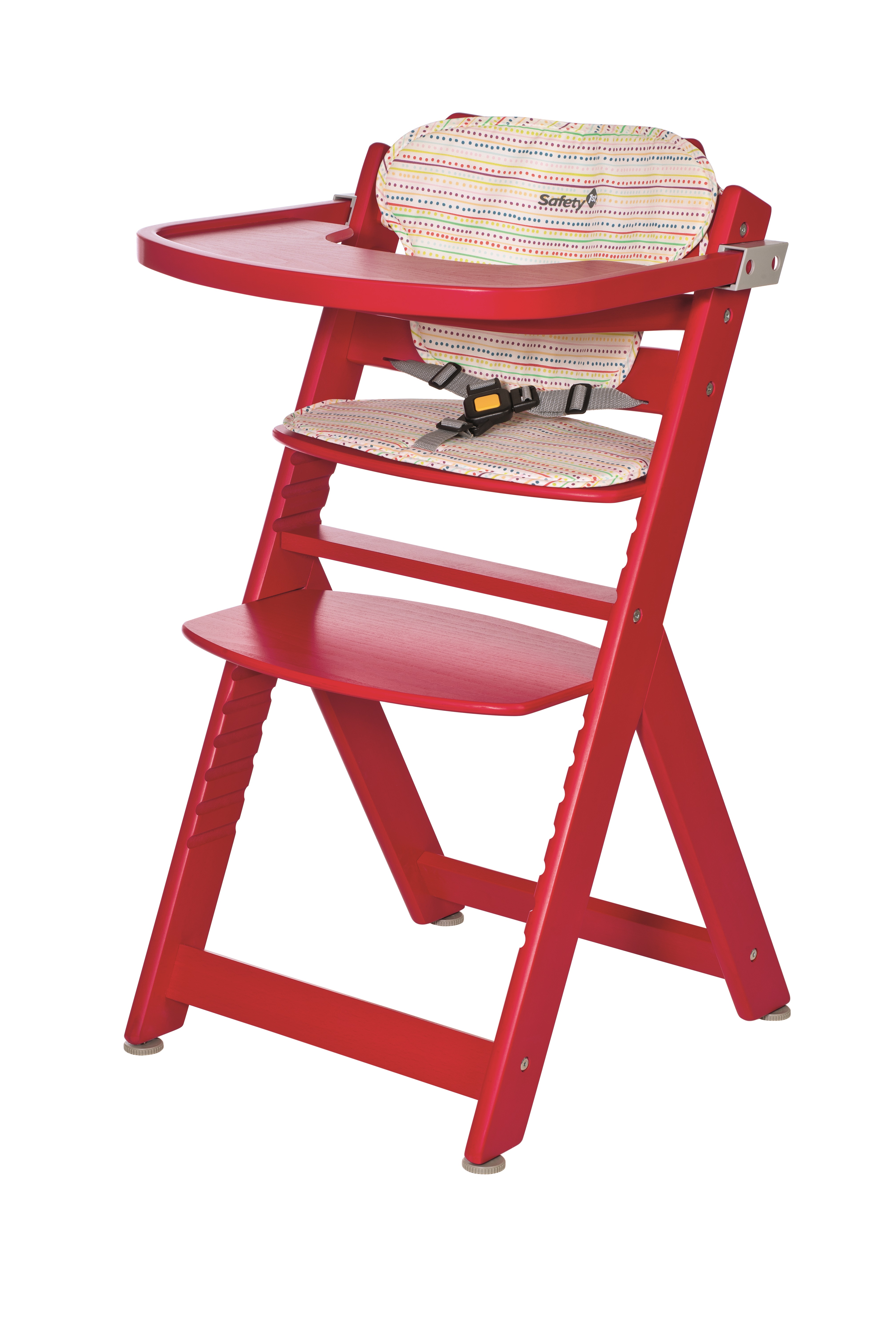Chaise haute bois Timba rouge et ses deux coussins (le 2ème coussin est offert), cette chaise haute évolutive permettra d'accompagner bébé pendant sa croissance.