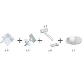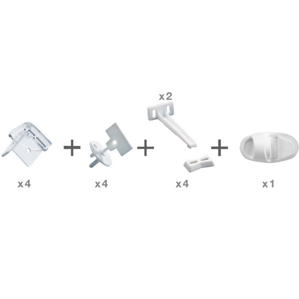 4 protèges coins, 4 caches prises avec 2 clés de démontage, 4 bloque tiroirs, 1 bloque placard magnétique