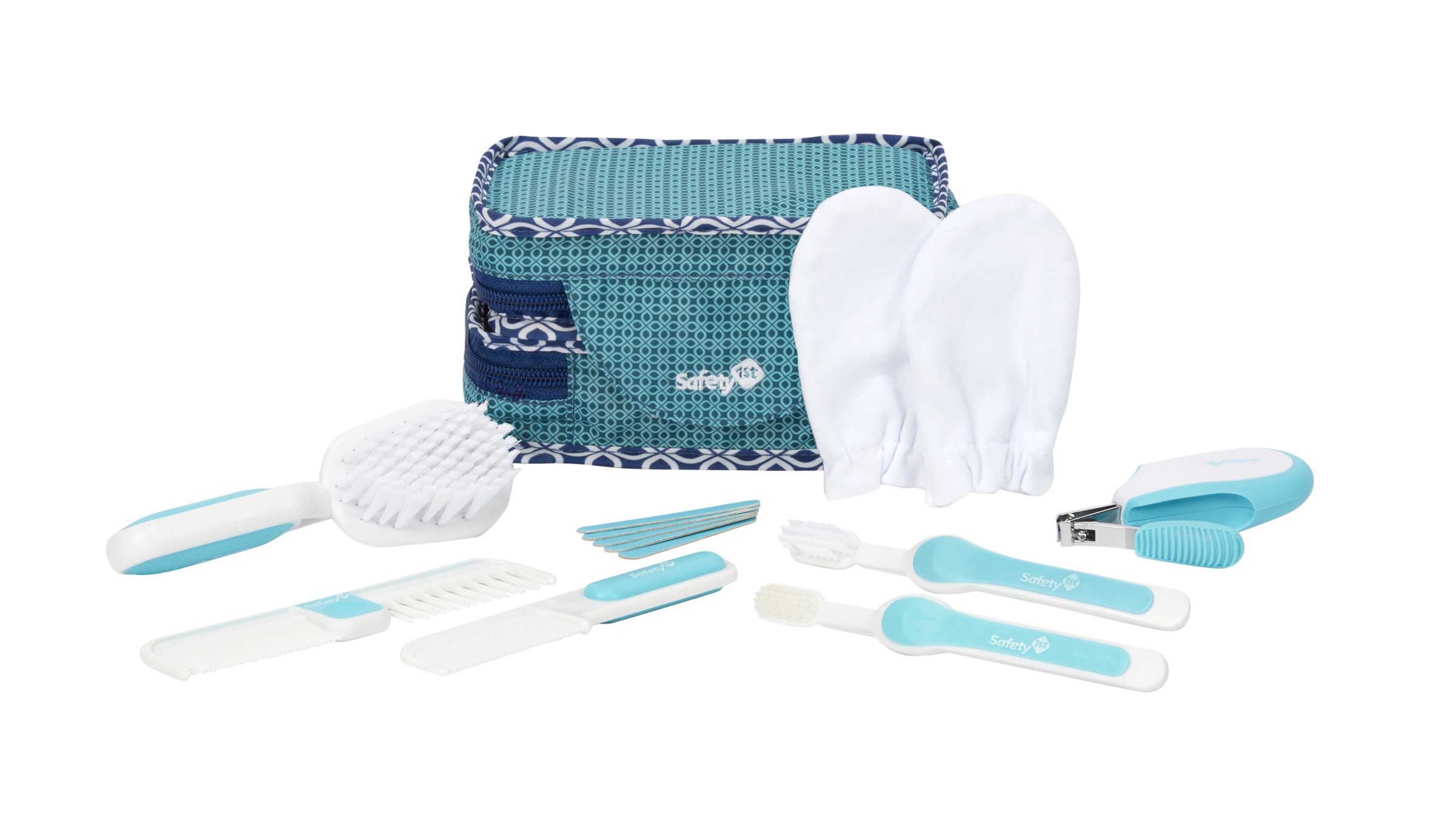 Super cette trousse de soin bébé Safety First ! Elle dispose de tous éléments nécessaires pour la toilette de bébé ! Elle est équipée d'une brosse et d'un peigne avec poignée soft grip pour faciliter la prise en main, d'un peigne pour nourrissons, d'une brosse à dents, d'une brosse à dents avec stimulateur de gencives pour nourrissons, d'un coupe-ongles avec poignée anti-dérapante, de 8 limes éméries, de 2 paires de moufles et pour finir sa trousse de voyage pour tour ranger !