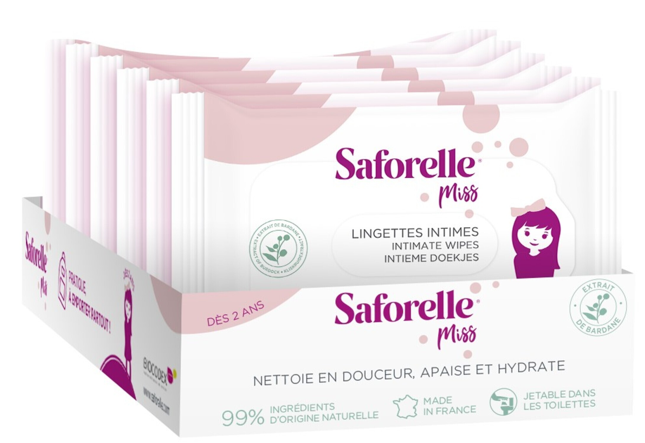 Le geste douceur pour la toilette de votre Miss Avec une formule composée à plus de 99,6% d'ingrédients d'origine naturelle et enrichie en bardane, les Lingettes intimes Saforelle Miss nettoient en douceur, apaisent et laissent la peau douce et hydratée. Pratiques, elles facilitent l'apprentissage de la propreté. En tissu 100% biodégradable et compostable**, elles sont jetables dans les toilettes. Dès l'âge de 2 ans. Testées sous contrôle pédiatrique. * En tissu 100% biodégradable et compostable ** Tissu compostable industriellement