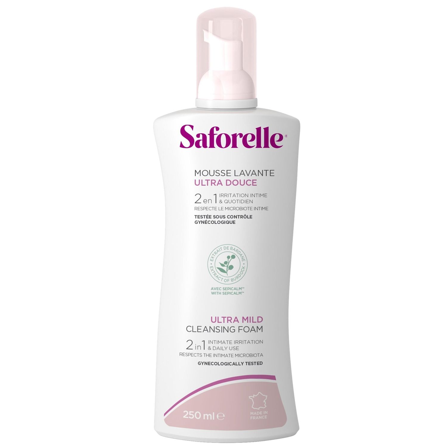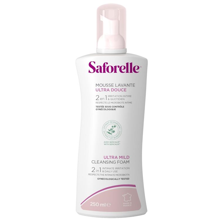 SAFORELLE, LA MARQUE EXPERTE DES SOINS INTIMES DEPUIS 1989. La MOUSSE LAVANTE ULTRA DOUCE est spécialement formulée pour la toilette intime et corporelle. Elle peut être utilisée pour réduire les sensations d'irritations intimes. Celles-ci peuvent survenir dans des situations quotidiennes telles que les frottements avec les sous-vêtements ou les protections périodiques, la transpiration, la pratique de certains sports ou même après les rapports sexuels. Cette mousse est spécialement adaptée pour nettoyer en douceur et limiter les frottements en cas de sensibilité notamment lors du post-partum. Adaptée au pH intime, elle convient aux peaux sensibles et irritées. Usage externe uniquement. Apaise les irritations en période d'inconfort intime. Respecte l'équilibre du microbiote intime au quotidien. Nettoie la peau en douceur. 98% d'avis positifs sur le soin. Texture et parfum agréables Sans savon et testé sous contrôle gynécologique et dermatologique, ce produit peut être utilisé au quotidien. Il est adapté dès l'âge de 10 ans et convient également aux femmes enceintes ou allaitantes. Ce soin lavant SAFORELLE est fabriqué en France, et sa formule douce est conçue pour respecter la sensibilité de la zone intime. Cette formule sans savon garantit une tolérance optimale sans compromettre le bien-être et le confort. De plus, ce soin lavant a été soigneusement conçu pour être compatible avec le microbiote intime et pour respecter la flore intime au quotidien. La MOUSSE LAVANTE ULTRA DOUCE a été testée sous contrôle médical, au travers de tests cosmétiques rigoureux, pour apporter une solution efficace aux femmes. 98% des femmes rapportent un effet apaisant, Texture de mousse légère et aérée, permettant une application douce limitant les frottements. Facile à rincer. 98% des femmes ressentent une sensation de bien-être Sensation perçue. Test d'usage - 50 volontaires – 28 jours – 2021