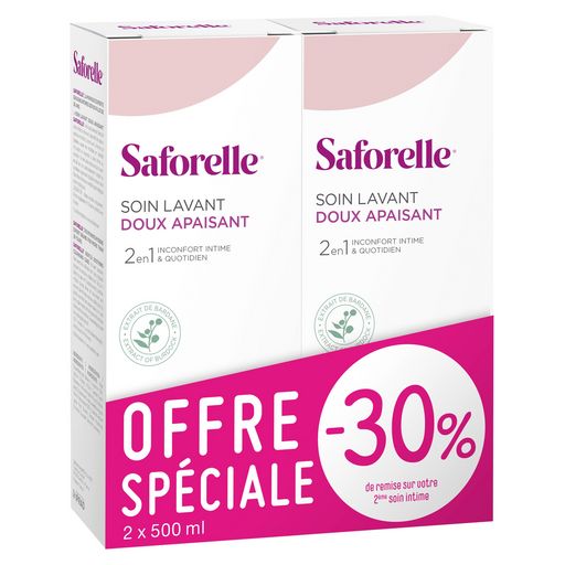 Soin Lavant Doux Saforelle 500 ml est formulé pour la toilette intime des peaux sensibles ou irritées. Il nettoie en douceur, calme les irritations et les sensations d'inconfort. Usage quotidien.