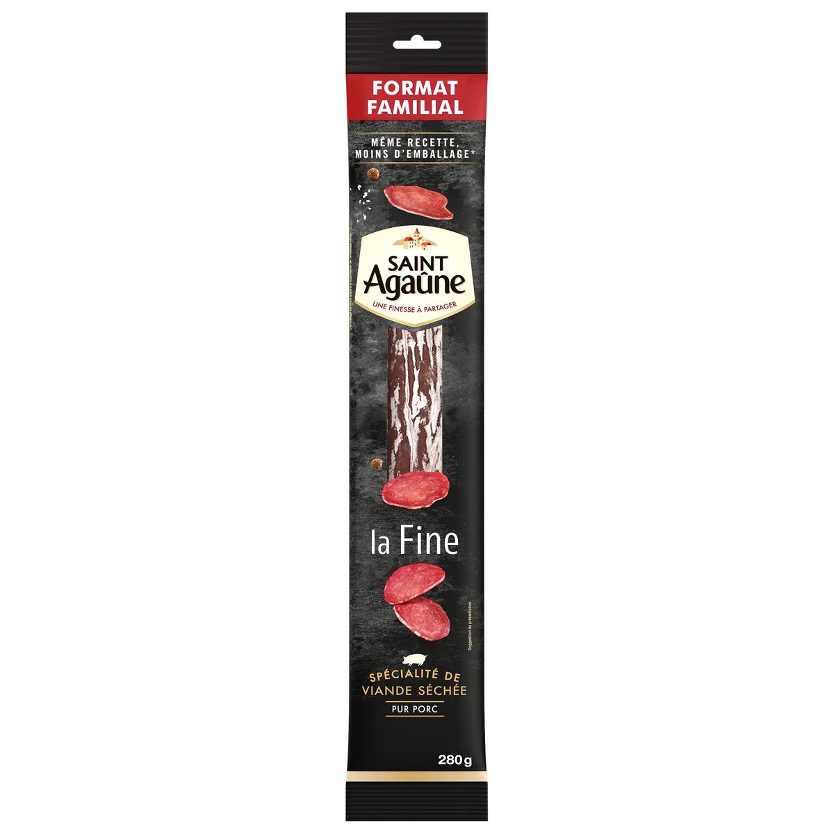 Ingrédients : Viande de porc* ; sel ; LACTOSE ; dextrose ; sucre ; poudre de LAIT ; vin ; arômes naturels ; épices ; ferments ; conservateurs : nitrate de potassium, nitrite de sodium ; enveloppe collagénique (collagène, eau, humectant : glycérol). Viande d'origine UE rigoureusement sélectionnée. *183g de viande de porc mis en oeuvre pour l'élaboration de 100g de "Saint Agaûne".
