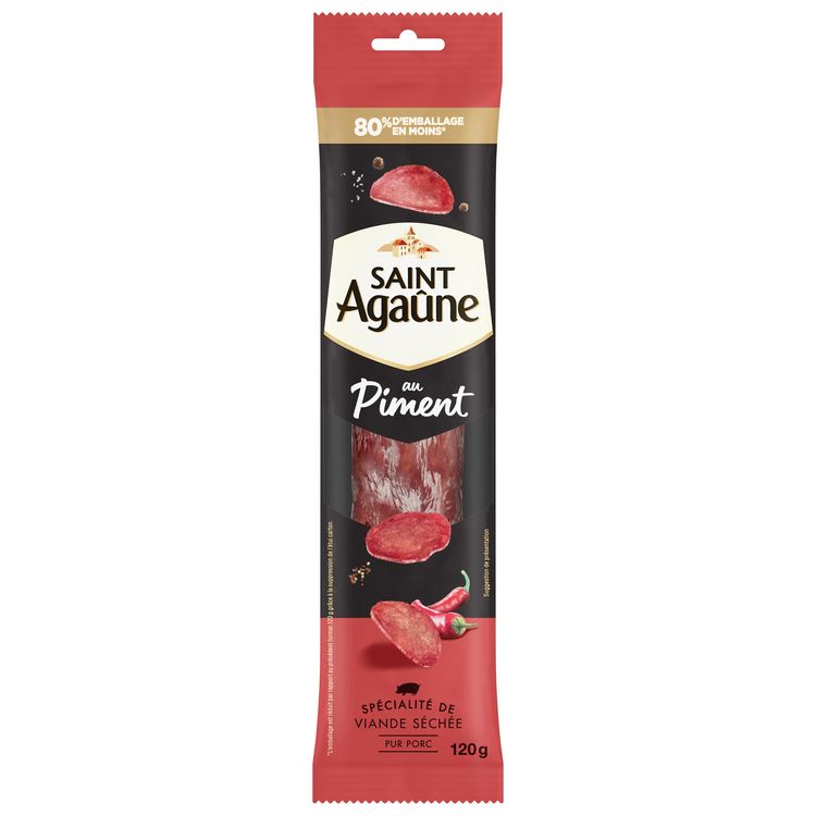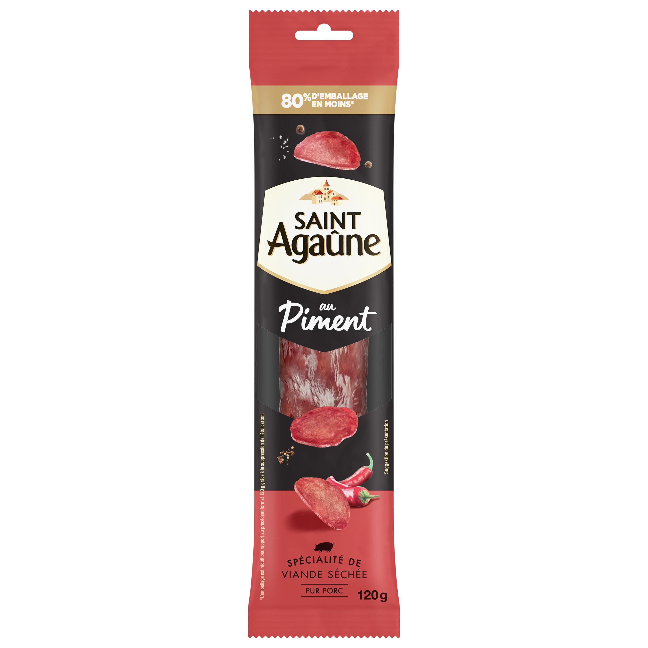 Fruit de plus de 20 ans de savoir-faire, Saint Agaûne est confectionné à partir de pièces nobles du porc, sélectionnées et assaisonnées avec soin. Découvrez Saint Agaûne au Piment, l'alliance gourmande de la fine saveur de viande séchée relevée d'une pointe de piment pour une recette toujours, deux fois moins grasse qu'un saucisson classique.