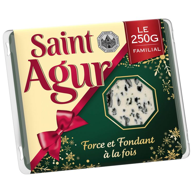 Saint Agur c'est l'alliance unique de la force (son goût) et du fondant (sa texture). Unique et authentique, Saint Agur est un bleu élaboré dans le strict respect du savoi-faire fromager. Issu d'une meule à la forme octogonale unique, ce fromage à pâte persillée a du caractère : un goût de bleu intense et une texture fondante, pour un plaisir extrême. Un format familial adapté aux gros foyers.