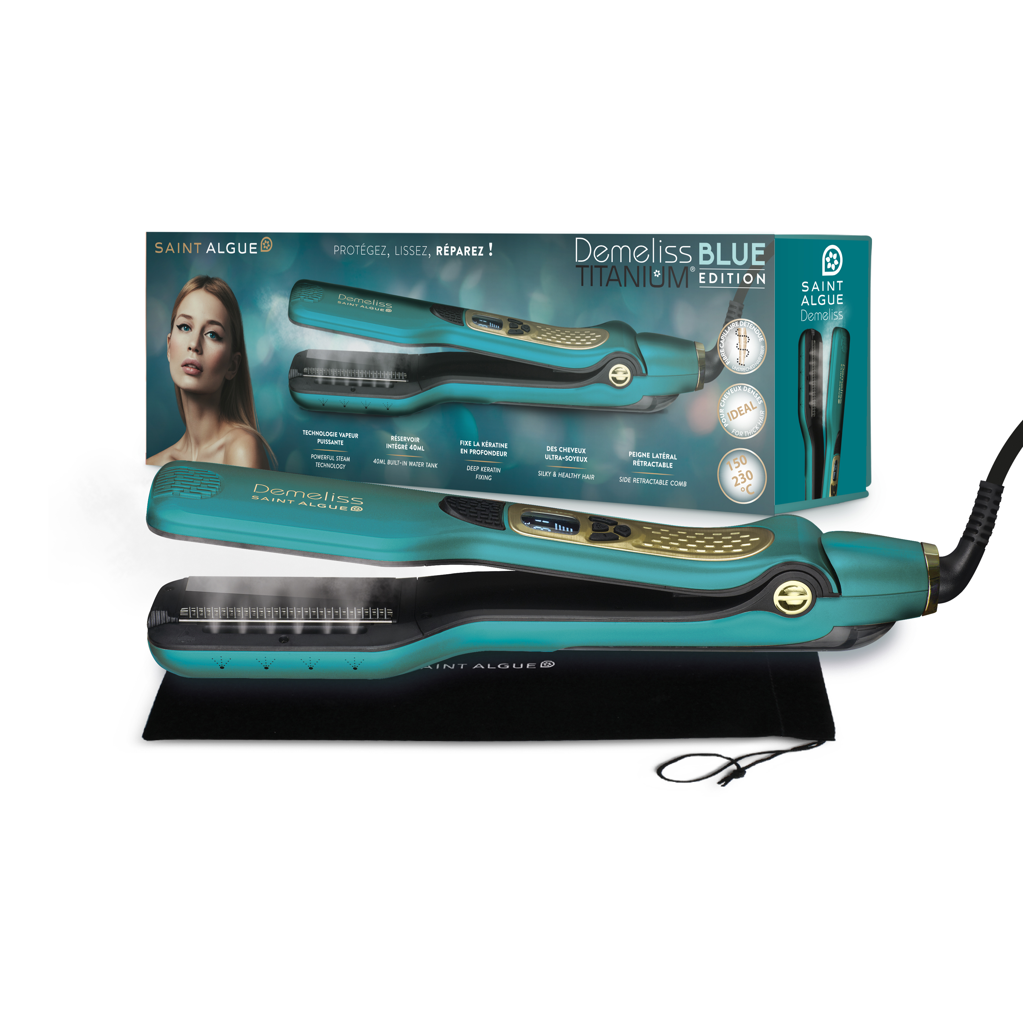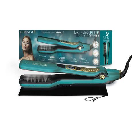 Le lisseur à vapeur Titanium Blue de la marque Saint Algue dispose de 5 niveaux de températures allant de 150 à 230°C permettant de s’adapter aux besoins de vos cheveux. Revêtu de plaques en Titane et de 6 buses vapeur, il vous offre un lissage parfait tout en ayant un maximum de protection. Sa fonction anti-frisottis vous permet de toujours avoir des cheveux avec un fini soyeux. Ce lisseur est équipé d’un réservoir d’eau amovible de 40 ml et d’un écran LCD qui affiche la température de chauffe pour un contrôle précis de la température. Pour plus de sécurité, le lisseur s’arrête automatiquement après 60 min.