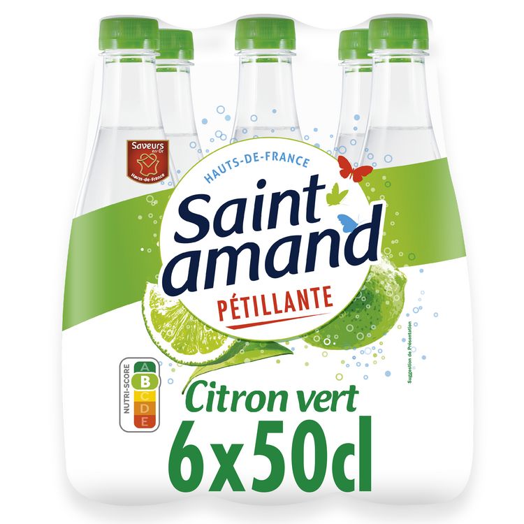 Saint Amand vous propose une eau minérale gazeuse aromatisée au citron, citron vert . Cette eau se compose d'eau minérale naturelle gazéifiée et d'arôme naturel. Elle est sans sucre et possède 0 calorie.