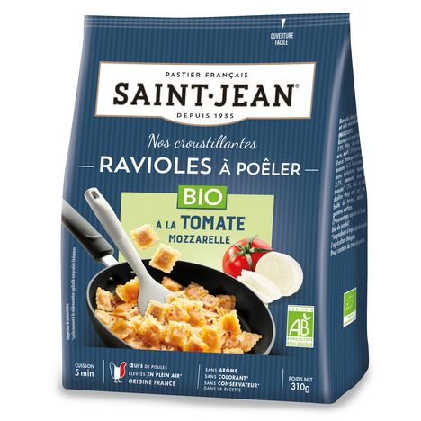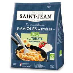 Ravioles à la tomate et à la mozzarella 77% (Pâte : farine de BLE tendre*, eau, OEUFS* 3.8%, huile de tournesol*, Farce : FROMAGE blanc frais*, coulis de tomate* 6,2%, flocons de pommes de terre déshydratées*, MOZZARELLE* 3,1%, EMMENTAL*, double concentré de tomate* 1,9%, basilic*, sel, huile d'olive vierge extra*, sucre*), eau, huile de tournesol*. (Pourcentages exprimés sur l'ensemble du produit) *Ingrédients d'origine agricole issus de l'agriculture biologique