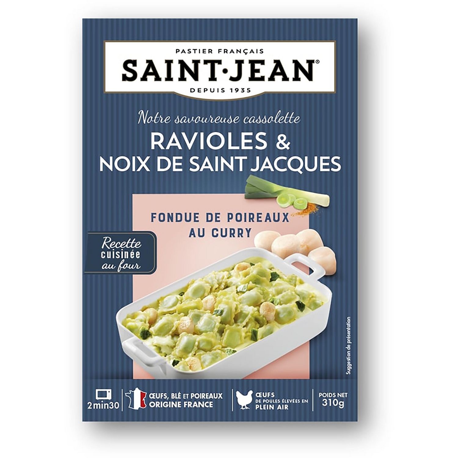 Saint Jean, pastier français depuis 1935, met aujourd'hui tout son savoir-faire au service d'une gamme Traiteur. Pratique, rapide et créative, elle sait répondre à chaque envie du quotidien. Saint Jean s'engage dans la réduction des emballages: -14% de plastique*, barquette issue à 80% de matérieux recyclés, -14% de carton*, fourreau carton imprimé à base d'encre végétale pour réduire l'empreinte écologique. *par rapport à notre ancien emballage
