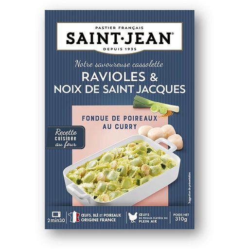 Ravioles 38% (pâte : farine de BLE tendre 14%, eau, OEUFS frais 1.8%, contient huile de tournesol et/ou huile de colza. Farce : EMMENTAL, FROMAGE blanc frais, persil, sel, OEUFS frais 0.3%, BEURRE, eau), eau, CREME, poireaux 8,3%, noix de Saint Jacques* (MOLLUSQUE) 8% {Zygochlamys patagonica (Argentine) ou Argopecten purpuratus (Perou) ou Chlamys opercularis (Royaume Uni, Irlande ou Iles Feroé)}, farine de BLE 1.9%, BEURRE, préparation à base de vinaigre, sel, curry, poivre. * voir à l'emplacement de la date limite de consommation (Pourcentages exprimés sur l'ensemble du produit)