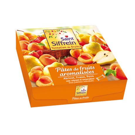 Assortiment de pâtes de fruits abricot, fraise, poire et mûre à la pulpe de fruits véritable. Votre allié pour des instants gourmands et fruités.