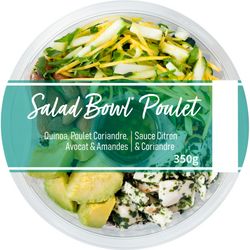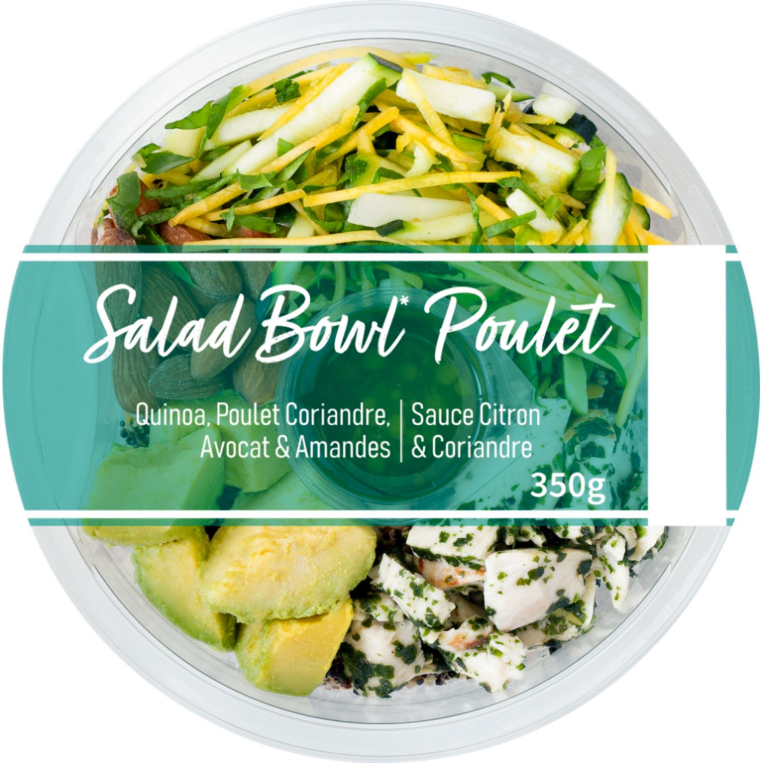 Salade composée de quinoa, d’émincés de filet de poulet traité en salaison rôti, d’avocat et d’amandes accompagnée d’une sauce au citron et à la coriandre.