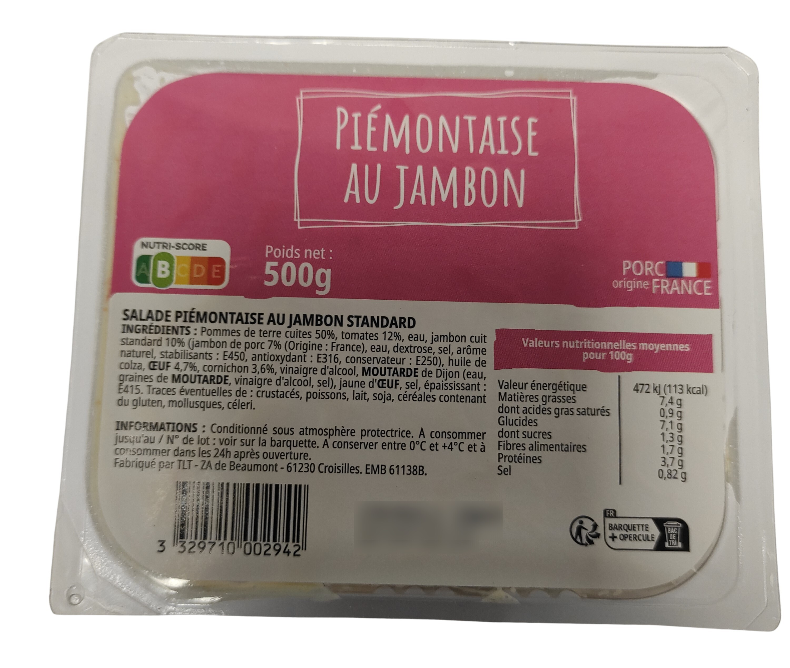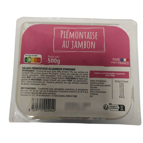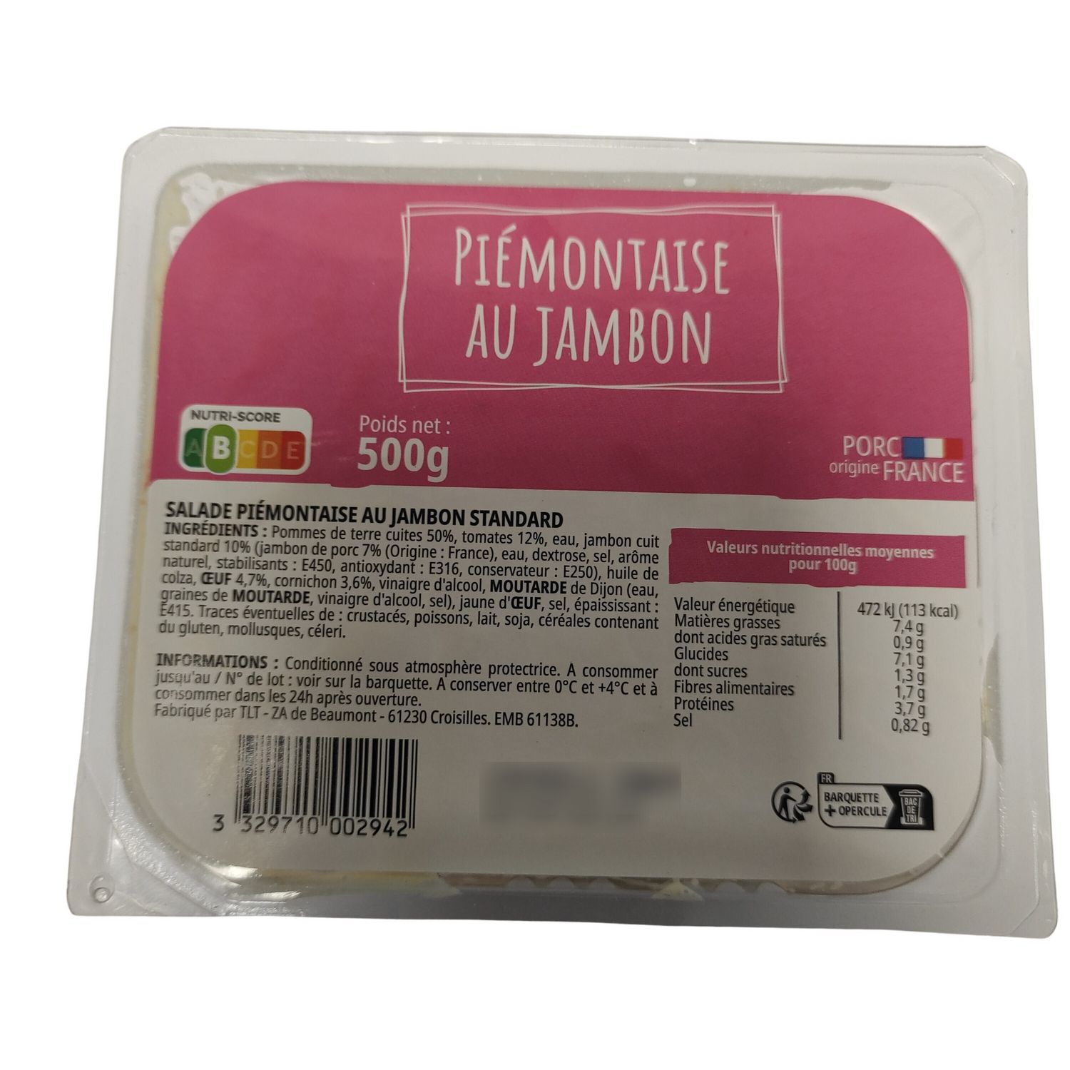 Pommes de terre cuites 50%, tomates 12%, eau, jambon cuit standard 10% (jambon de porc 7% (Origine : France), eau, dextrose, sel, arôme naturel, stabilisants : E450, antioxydant : E316, conservateur : E250), huile de colza, ŒUF 4,7%, cornichon 3,6%, vinaigre d'alcool, MOUTARDE de Dijon (eau, graines de MOUTARDE, vinaigre d'alcool, sel), jaune d'ŒUF, sel, épaississant : E415.