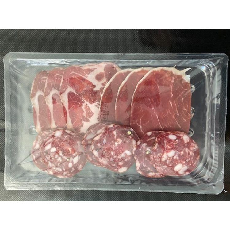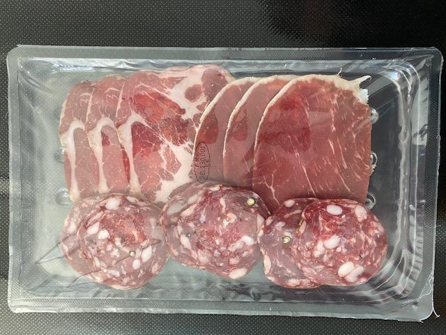 Ingrédients : Assiette de charcuterie composée de : Jambon sec, de la Coppa fumée au feu de bois, Saucisson sec de l'Île de beauté