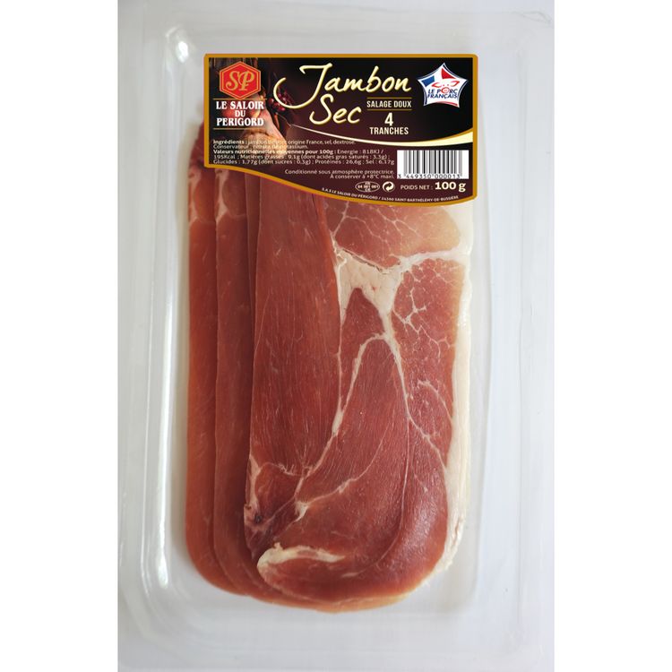Ingrédients : Jambon de porc origine France, sel, dextrose. Conservateur : nitrate de potassium.