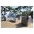 Set composé : 1 table basse 100x60x45 cm – 1 sofa 2 places 117x67x72 cm, 2 fauteuils 63x67x72cm, Structure en acier, résine tressée coloris gris, plateau en verre trempé finition béton poli, coussins en polyester déhoussables."