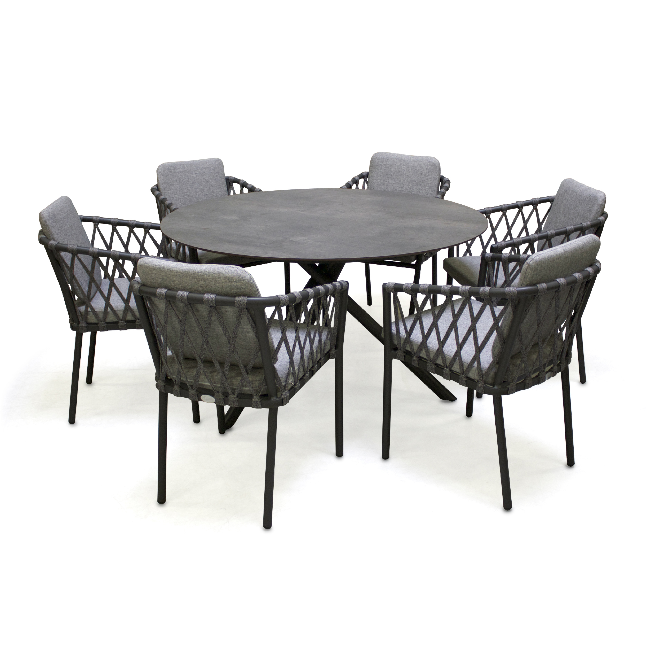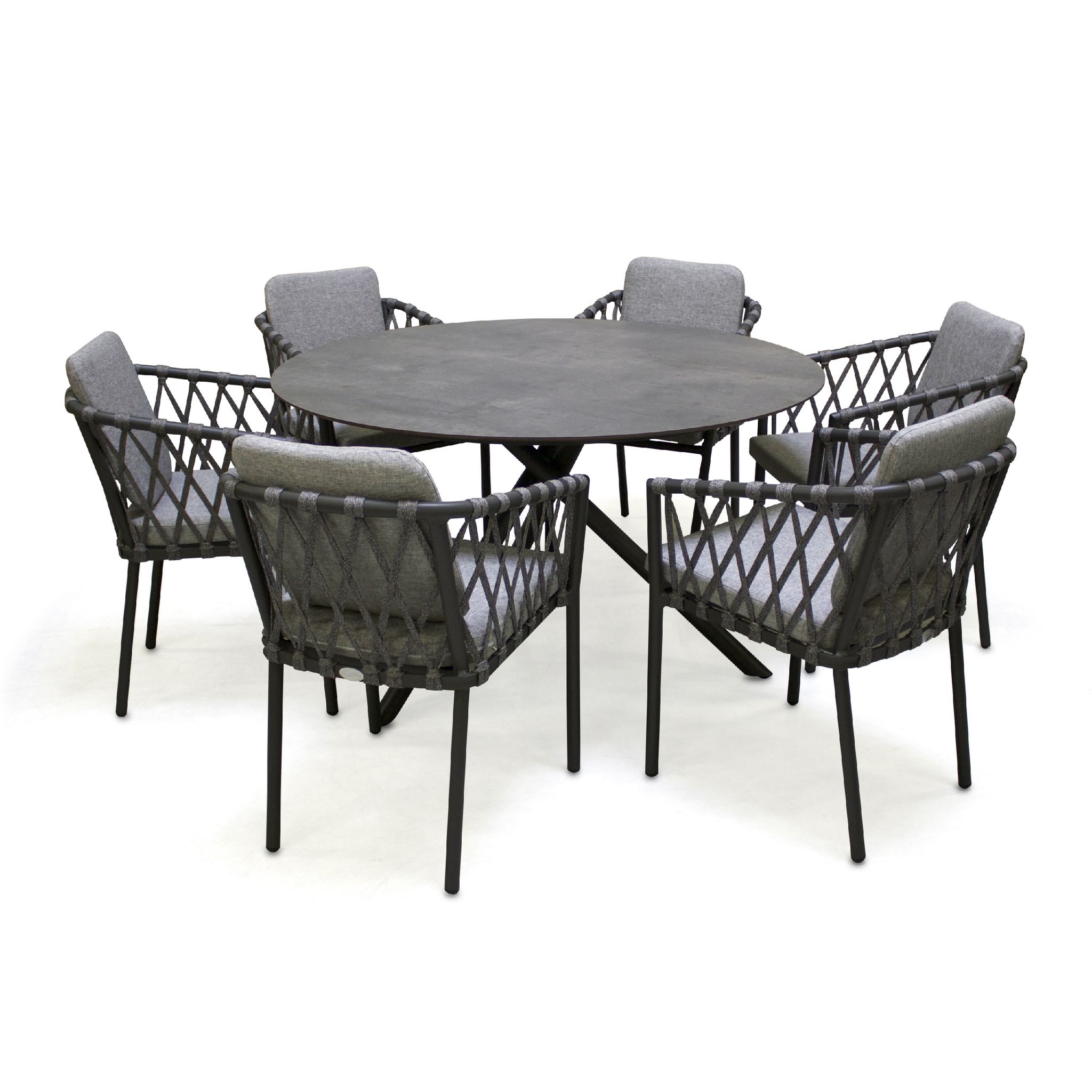 La table de jardin ronde PILAT avec pieds croisés en aluminium est surmontée d'un élégant plateau HPL effet pierre, de couleur gris anthracite.