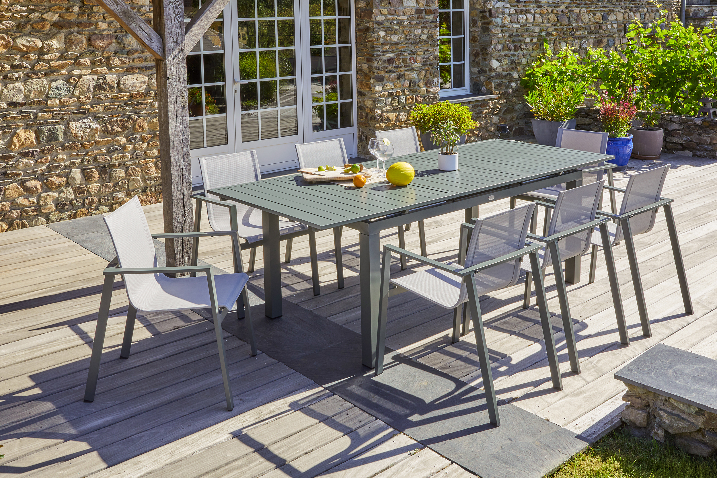 Table de jardin 240/300cm avec allonge automatique + 8 fauteuils de jardin MIAMI